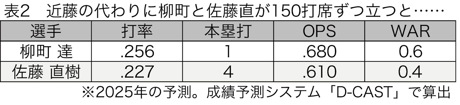 とはいえ、打撃成績の差だけでは勝利への影響がどれほどかを正確に把握するのは難しい。そこで再びWARを使って実際の勝利数に換算してみよう。近藤は3か月間の出場でWAR3.5が見込まれていた。この穴を柳町と佐藤直の2人で分担して埋めた場合、WARはどの程度になるだろうか。D-CASTの予測によれば、2人がそれぞれ150打席ずつ立つと仮定すると柳町はWAR0.6、佐藤直は0.4を記録する。合計するとWAR1.0だ。