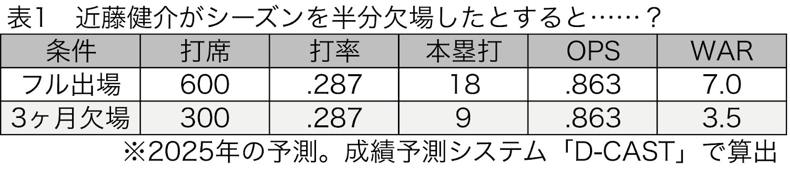 まずは近藤がシーズン143試合にフル出場し、600打席に立ったと仮定する。このときの打撃成績は打率.287、18本塁打、OPS.863を記録するとの予測が出た。1軍復帰に3か月がかかり、6月末まで欠場した場合は、ほぼシーズンの半分となる71試合(4月1日から6月30日までに組まれている試合数)を棒に振る計算だ。そのため、フル出場した場合に仮定した600打席の半数にあたる300打席で、OPS.863の打者を失うことになる。