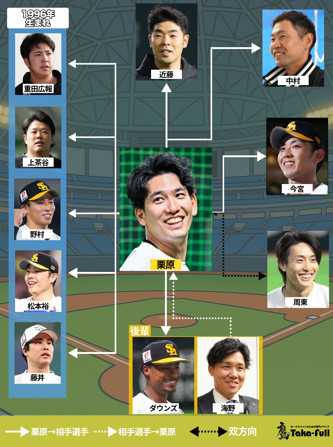 鷹フルでは今季から新たな企画「選手相関図」をスタートしました。前回の渡邉陸選手に続き、今回はチームの中心選手であり、明るいキャラクターでファンからも愛される栗原陵矢選手に、自身の周りの人物像について語ってもらいました! 意外な関係性が明らかに…?