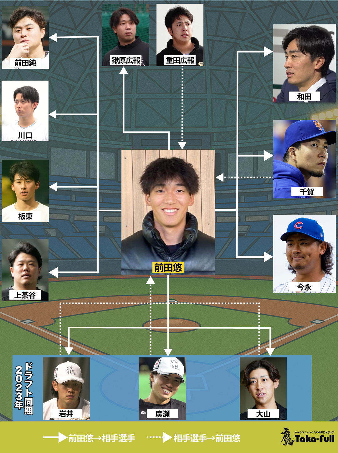 鷹フルでは今季から新たな企画「選手相関図」をスタートしました。前回の栗原陵矢選手に続いて、今回は前田悠伍投手を紹介いたします。たくさんの先輩から可愛がってもらっている19歳。最近関係が深まっているチームメートとして、名前を挙げたのは“イケメン2人”でした。