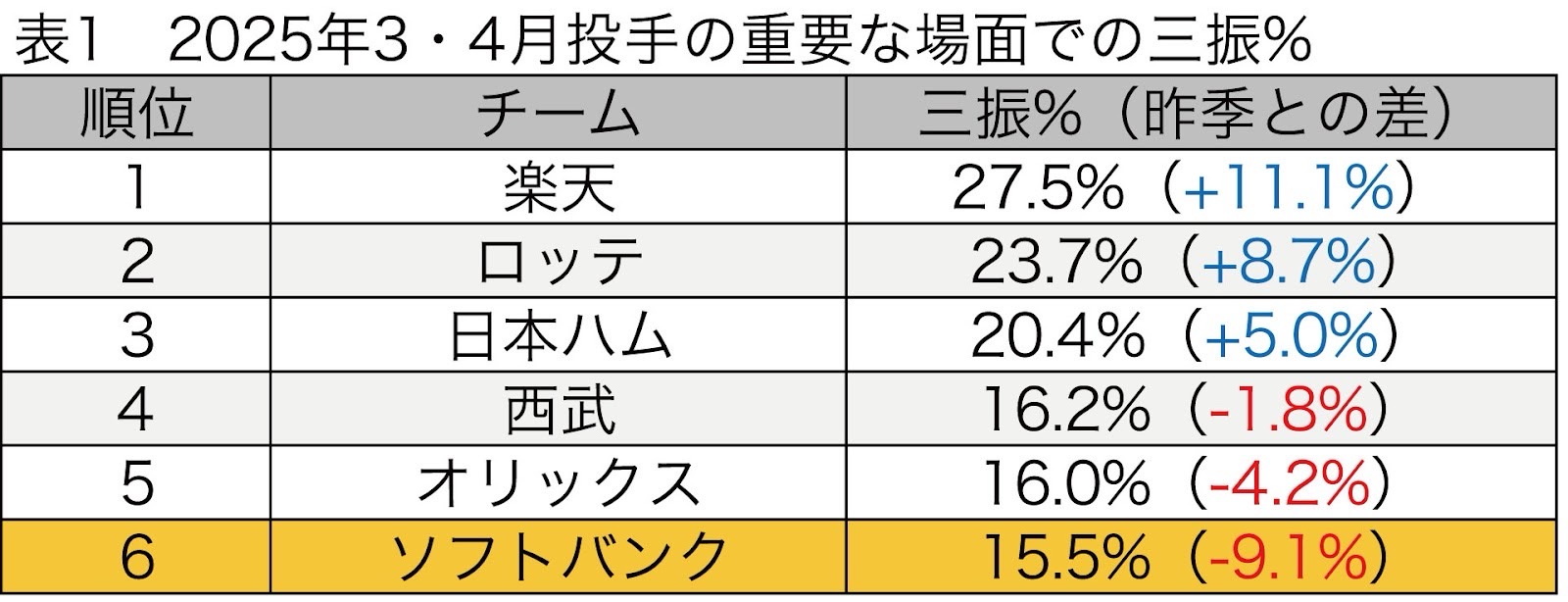 実はこの点において3、4月のホークス投手陣は深刻な問題を抱えていたのだ。三振の頻度を示す三振%(三振÷打者)で見ると、期間中に投手陣が記録した数値は17.9%。これはリーグ平均(18.3%)とほぼ同じだ。ところが、重要度「高」に絞ると、15.5%でリーグ最下位に落ち込むのだ。