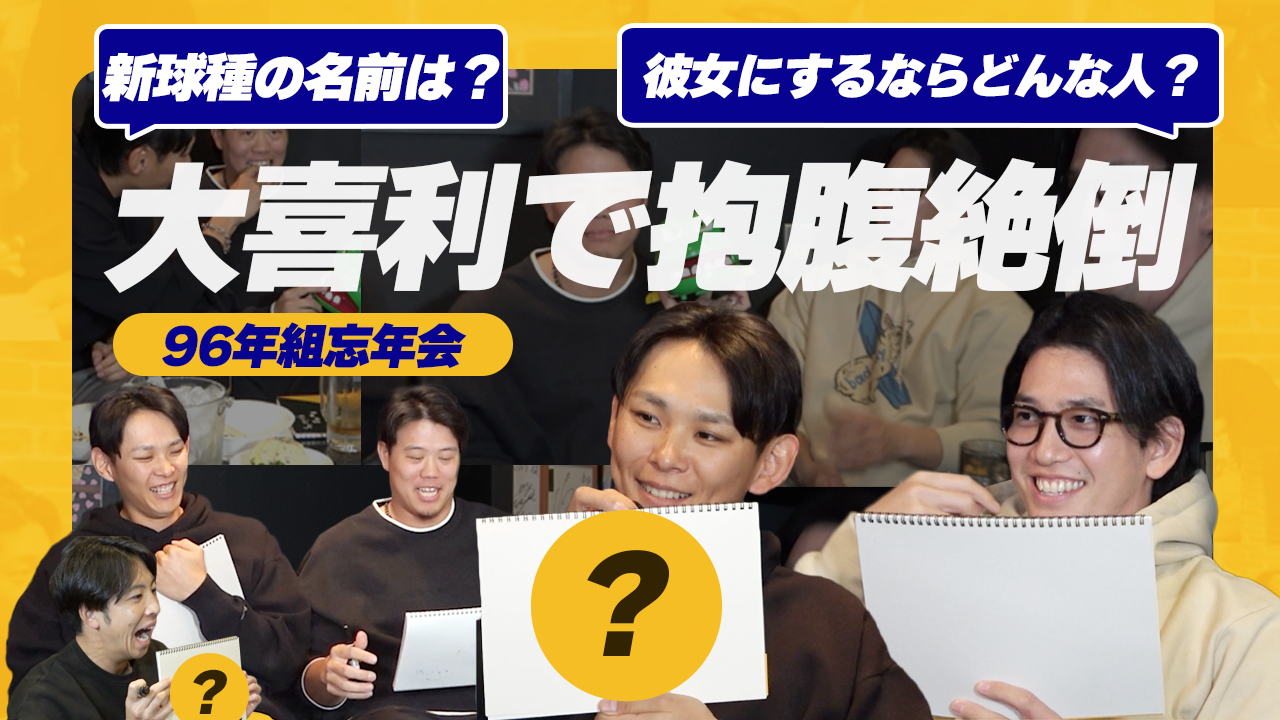 ホークスの「96年組忘年会」に鷹フルカメラが2年ぶりに密着しました! お馴染みのメンバーに加え、今回は上茶谷大河投手が新加入。巨人からは泉圭輔投手も参戦しました。久々の再会に話が弾む中、企画は恒例の「鷹フル大喜利」へ突入します。「もし彼女にするならどんな人?」「新球種の名前は?」というお題に対し、独特すぎるセンスが炸裂! グラウンドでは絶対に見られない爆笑回答の連発に、メンバー全員は“腹筋崩壊”状態に……。同学年ならではの「ワチャワチャ感」満載の爆笑トークをお楽しみください!