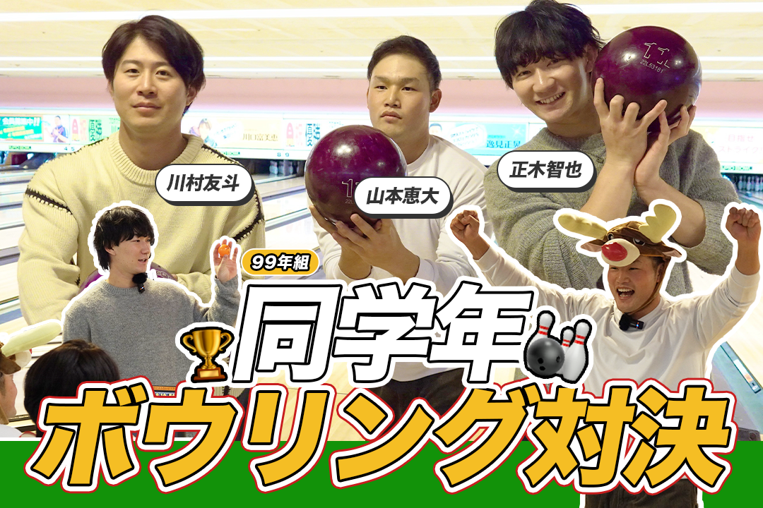 正木智也選手、川村友斗選手、山本恵大選手による「親友会」に鷹フルカメラが潜入しました。2022年ドラフトの同期入団&同学年。お互いを「親友」と認め合う3人が、初めてのボウリングロケに挑戦です。特別ルールで戦う中、口を揃えたのは「正木には勝ちたい」という対抗心。最後の最後には奇跡の“大逆転”も!? ストライクに大喜びし、ガーターに本気で悔しがる姿はまさに必見。グラウンドでは見られない新たな素顔をお楽しみください!