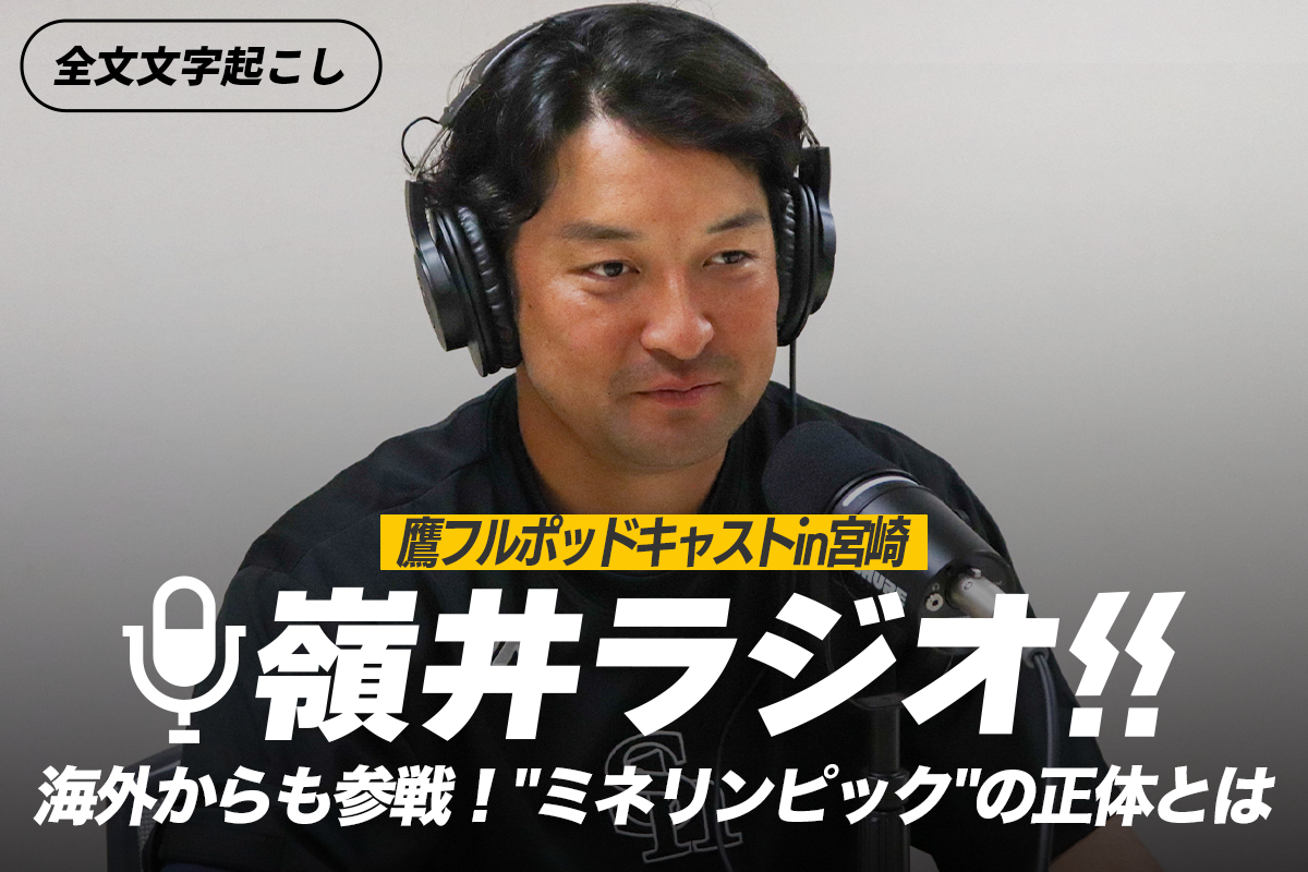 2026年からスタートした「鷹フルポッドキャスト」が宮崎に出張!春季キャンプ中も選手の“生の声”をたっぷりとお届けします。今回は嶺井博希捕手がゲストとして登場してくれました! 400人もいる「嶺井一族」が予定を合わせて集まる4年に1度の「ミネリンピック」とは――。“理解不能”の独特すぎる起床方法も明かしてくれました。色気たっぷりのハスキーボイスによる爆笑トークをどうぞお楽しみください!