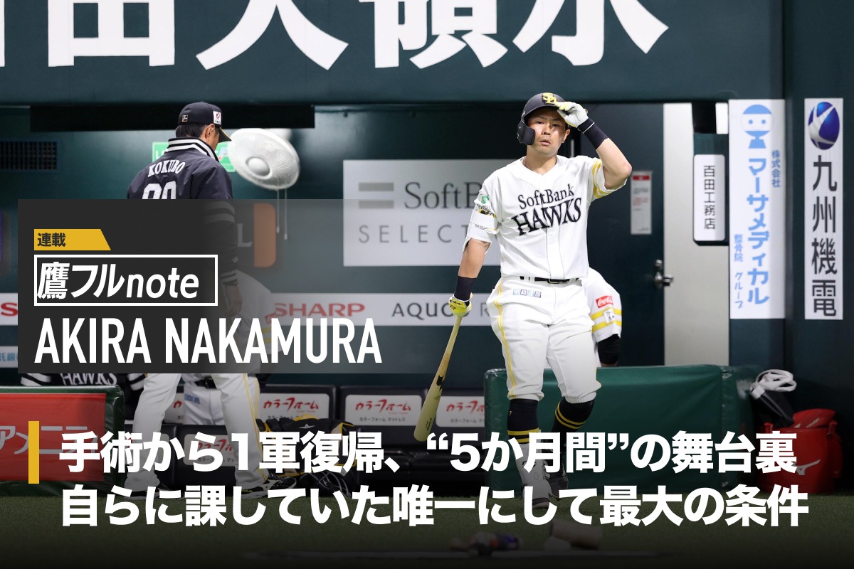 選手の本音に深く迫る「鷹フルnote」。中村晃内野手の“4月編”は「開幕1軍入りの舞台裏」をお届けします。1月から「微妙」と語っていた“3.27”のスタートに間に合った36歳。昇格するうえで自らに課していた唯一の条件とは。準備において「変えたくない」と語る部分や、2軍戦で得た確信についても明かしてくれました――。