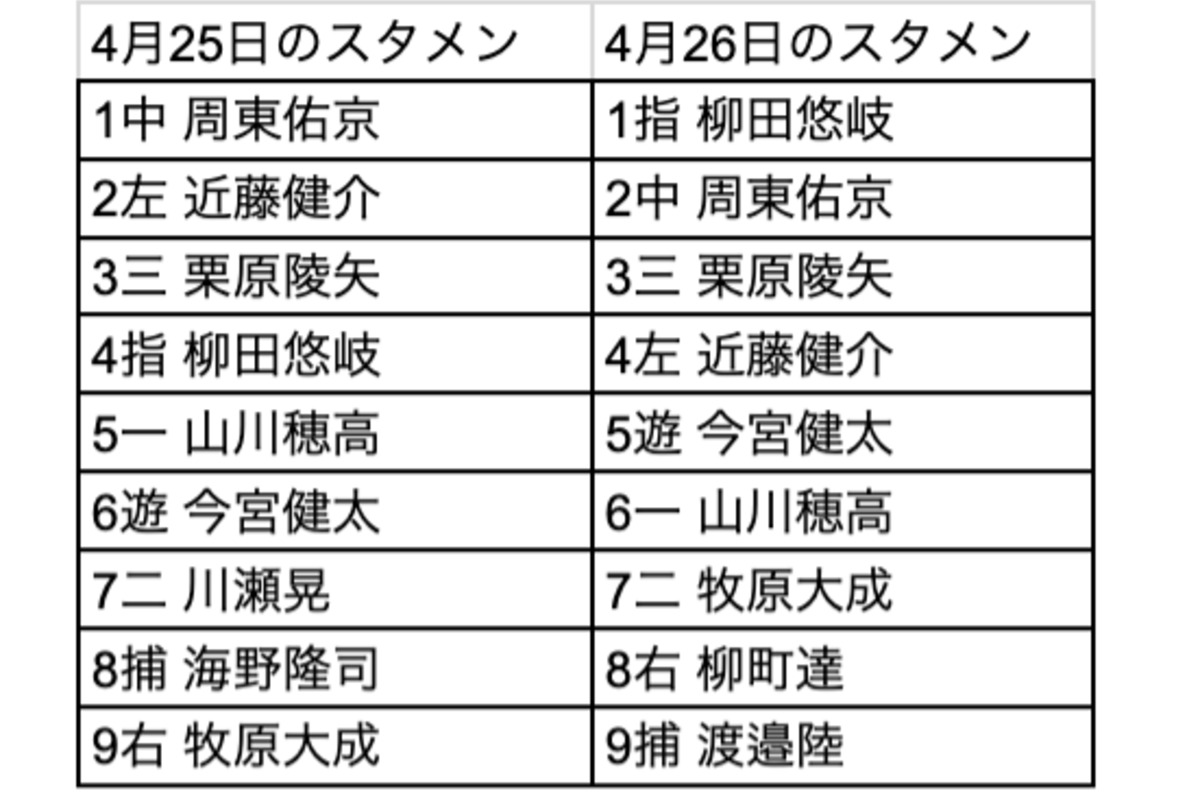 「得点圏打率が高いので。現状の打者の状態では近藤の後ろに入ってほしいのが今宮だったということです。 得点圏でも打ってくれるし、左右関係なくしっかり結果を残してくれるので、そこに落ち着いたという感じです。出塁率も高いバッターなので。もしかしたらバントもするかもしれないし、繋ぎ役にも徹せられるから。そこに入ってほしいな、という形できょうは入りました」