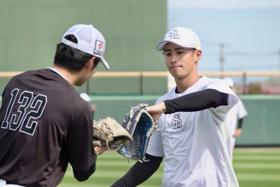 キャッチボール姿さえも絵になる2人だ。心地よい音を響かせていたのは板東湧梧投手と川口冬弥投手。立場は違えど、ともに1軍の舞台を目指す右腕。急接近した舞台裏に迫った。